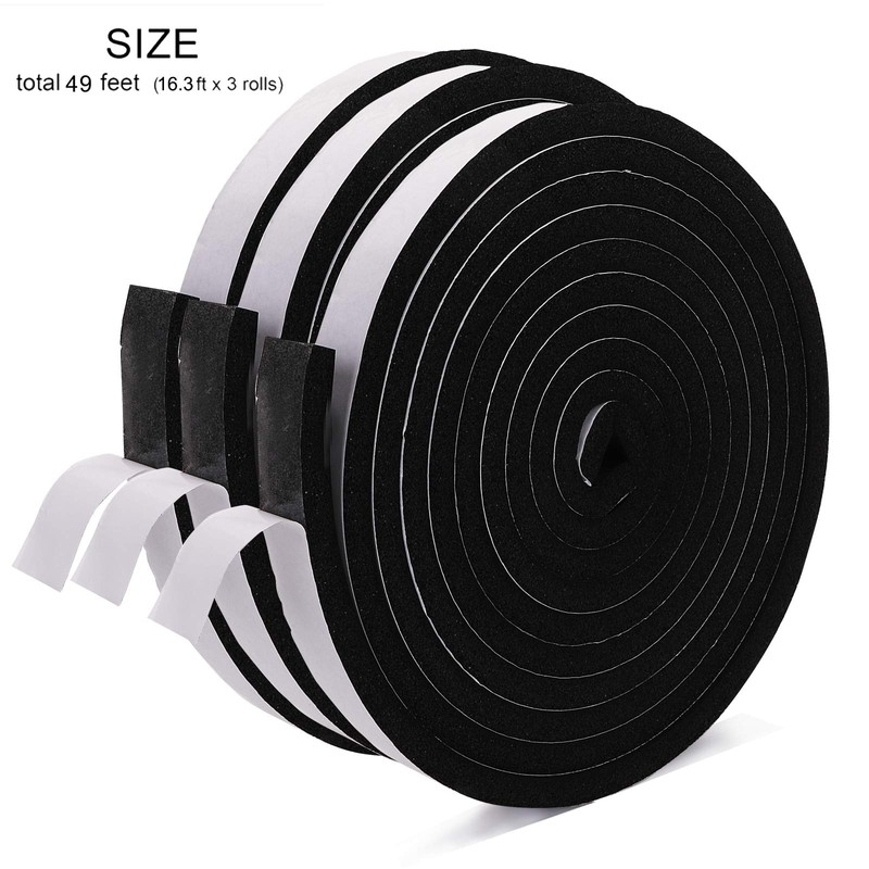 - Package includes 3 rolls of 1 inch wide x 1/2 thick x 16.3ft long foam tapes, total 49 feet long. The foam strip can be cut and bend into different sizes and shapes to meet your demand.