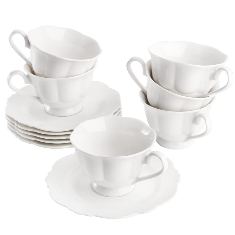 Jucoan Set of 6 Porcelain Tea Cups and Saucers, Bone China Tea Cup Set, 6 oz White Porcelain Tea Set, Coffee Cups, Espresso Cups for Latte Tea, British Tea Cups Gifts for Christmas