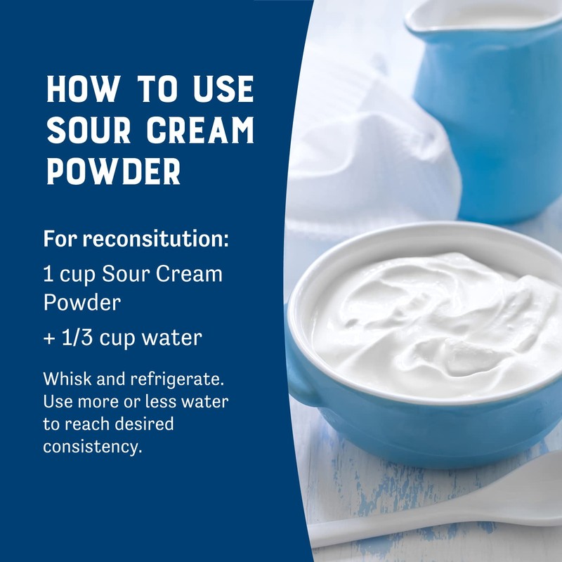 • For Sour Cream, combine 1 cup Sour Cream Powder with 1/3 cup water. Whisk and refrigerate, use more or less water to reach desired consistency.