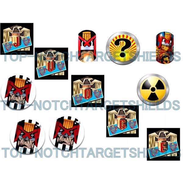 JUDGE DREED Pinball Target Cushioned Decals PLUS Drop Targets(not cushioned) Pinball Machine High Performance Target Cushioned Decal Set....these are not paper with Mylar over them.These decals have a heavy 10 mil Laminate installed over them,1/4" cushioned decals help make those super fast shots not riccochette like crazy in a result....breaking playfield plastics.....have more control over your game,pick up a set today!!!