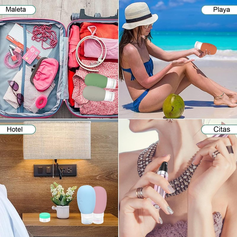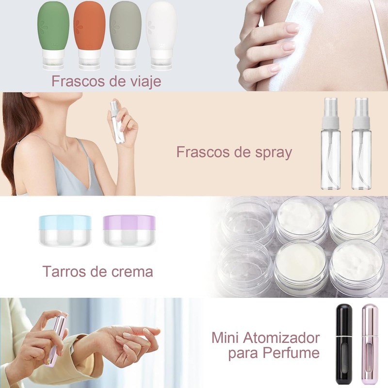- 🚀Fácil de transportar: juego de viaje incluye 4 botellas de silicona de 90ml, 2 Atomizador perfume de 5ml, 2 botellas de spray de 30ml, 2 botellas de crema facial de 15g, 2 cucharas pequeñas, 1 etiqueta y con una bolsa de lavado transparente de alta calidad con cierre. Es pequeño, fácil de transportar, es un buen compañero de viaje.