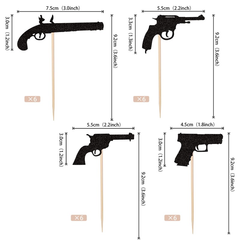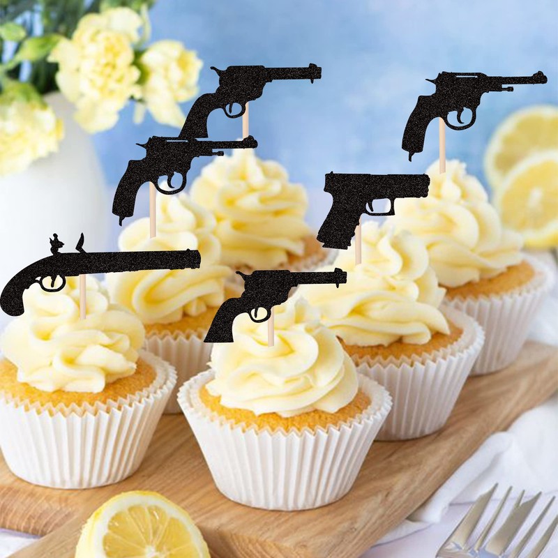 Juego de 24 adornos para magdalenas con purpurina negra para pistola de disparo, diseño de pistola, para baby shower, fiesta de cumpleaños, decoración de tartas