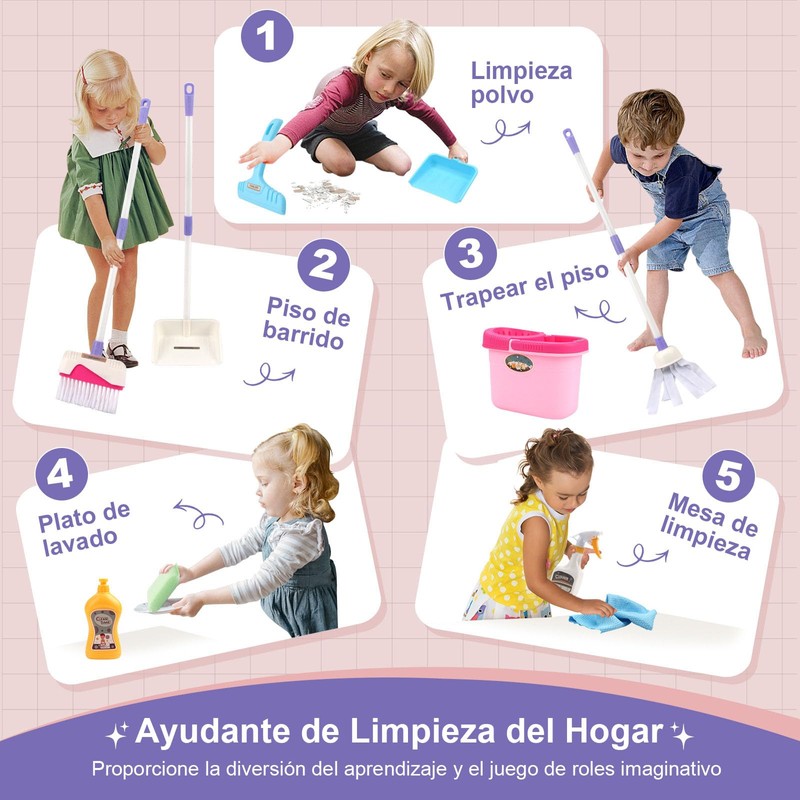 - 👧【Juego de Limpieza para Niños】Este juguetes de limpieza para niñas con 12 piezas mini herramientas de limpieza, incluyen escoba, recogedores, fregona, cepillo para polvo, spray, raspador, cubeta, esponja, jabón, paño y agente limpio. Ideal para que niños de todas las edades aprendan a utilizar productos de limpieza.
