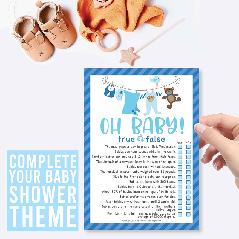 Juegos azules para baby shower para niños – 2 juegos de doble cara, 25 palabras para ideas de baby shower, 25 juegos de fiesta de bebé verdadero o falso, divertidos juegos de baby shower, suministros de fiesta de baby shower