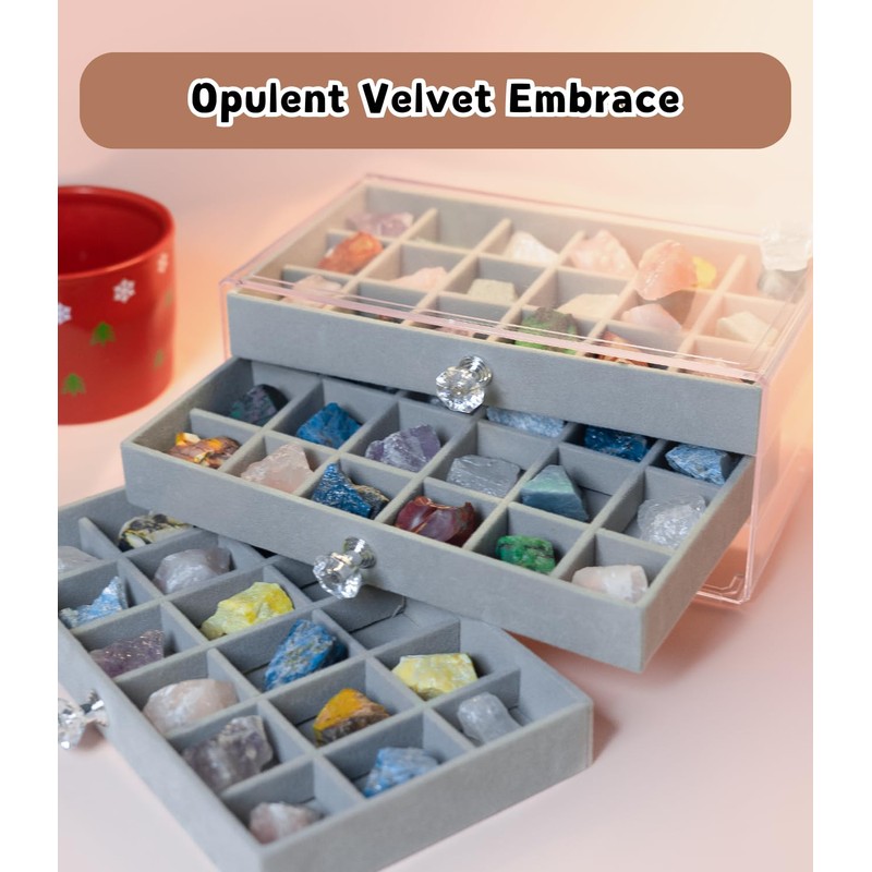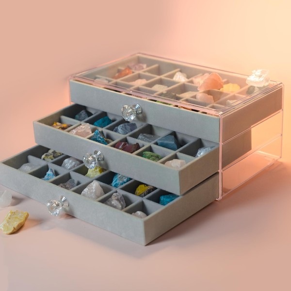 - Unprecedented Opulence: Crafted with thickened, crystal-clear acrylic, the outer shell of the jewelry organizer offers protection against dust, providing a captivating view of your collections. The result is a mesmerizing display that effortlessly captivates the eye. The interior drawer trays are swathed in sumptuous velvet, ensuring your favorite jewelry and rocks are cradled in luxury. Enhanced with upgraded round handles, accessing your treasures has never been more convenient