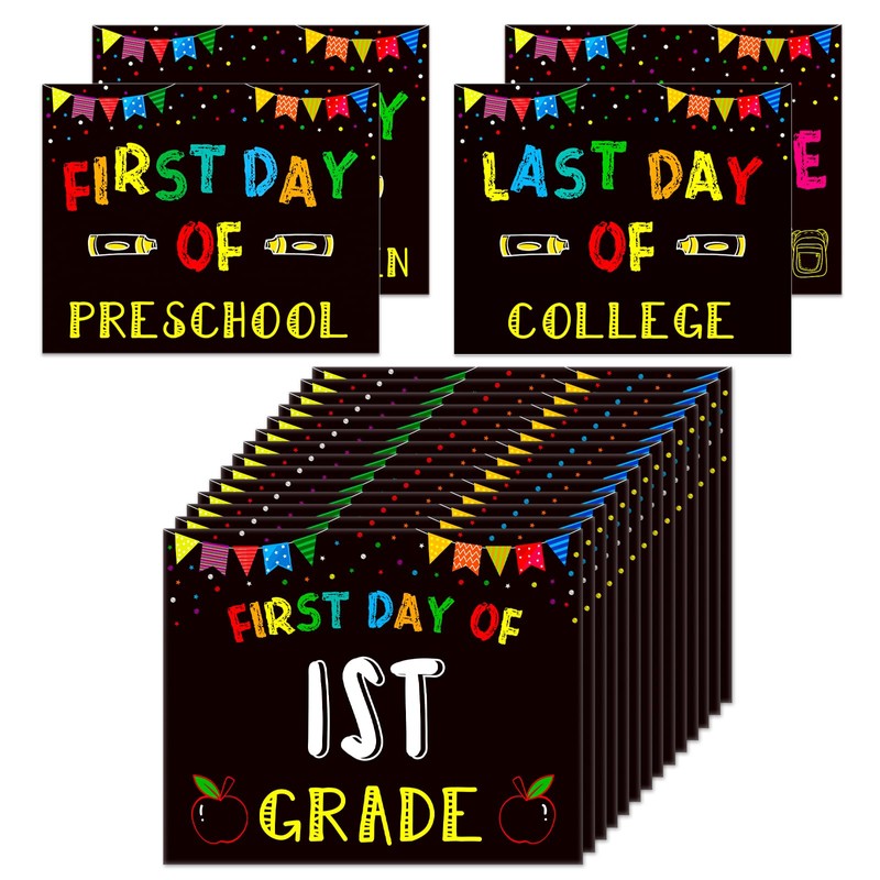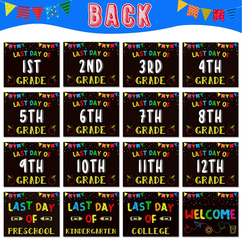 - 【First Day and Last Day of School Sign】: The first day of school signs contains 1pcs welcome sign and 15 grades signs from preschool, kindergarten, 1st-12th grade and college, almost the entire school career of your kids, you can take photos for them in the first day and last day of school of all these 15 grades, leaving unforgettable memories.