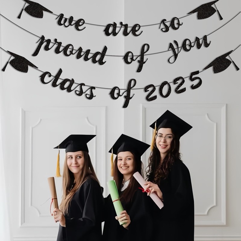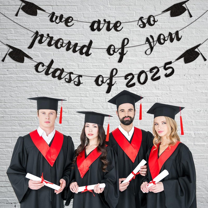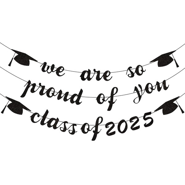- Class of 2025 Graduation Decorations Banner: Package includes 2 separate black glittery banners: 1 class of 2025 banners and 1 we are proud of you banners. Perfect for 2025 graduation party supplies decoration, classroom decorations, elementary school, high middle school yard, colleague graduation partty decoration, teacher graduation party decorations