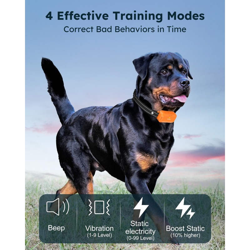 - 【4 Humanized Modes, Eliminate Bad Behavior Effectively】Our dog shock collar features 4 humane training modes: beep(standard), vibration(1-9 levels), safe shock(0-99 levels) and Shock Boost(10% higher). Enable you to set the right stimulation levels for your pet, which helps deter dogs from undesirable habits!