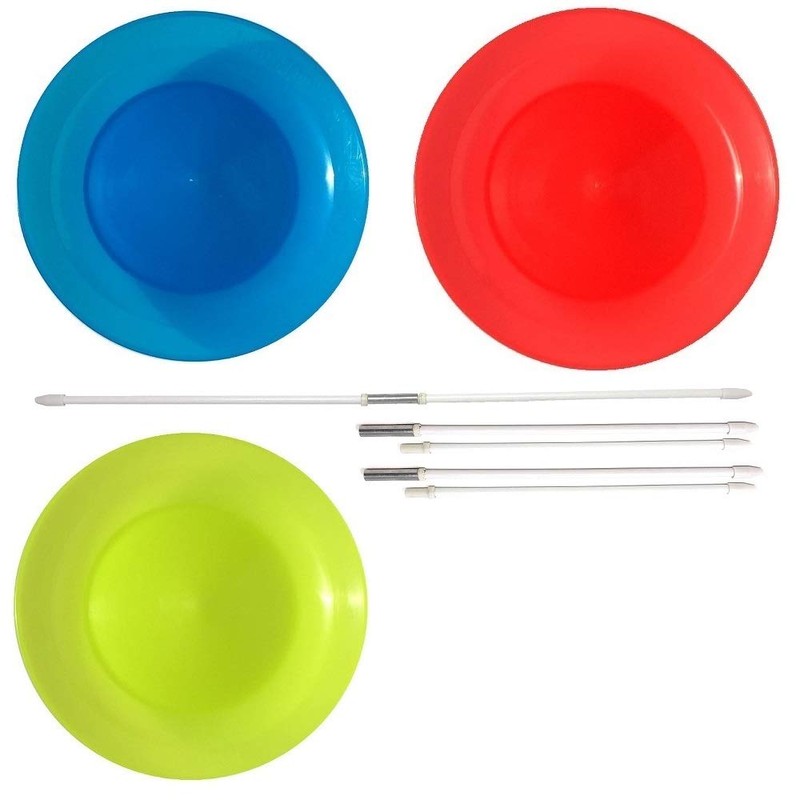 - Set of 3 JUGGLE 4 FUN dishes, and sticks. Deep design of the dimples in the center and back lip for easy turning even for beginners. The plates are made of plastic with a transparent feel that has good color. The soft material will not hurt your head or body. Recommended for parties and year-end parties. The outer box has instructions on how to turn it