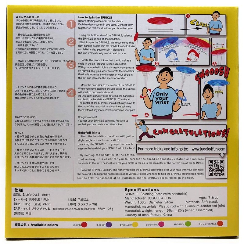 - Set of 3 JUGGLE 4 FUN dishes, and sticks. Deep design of the dimples in the center and back lip for easy turning even for beginners. The plates are made of plastic with a transparent feel that has good color. The soft material will not hurt your head or body. Recommended for parties and year-end parties. The outer box has instructions on how to turn it
