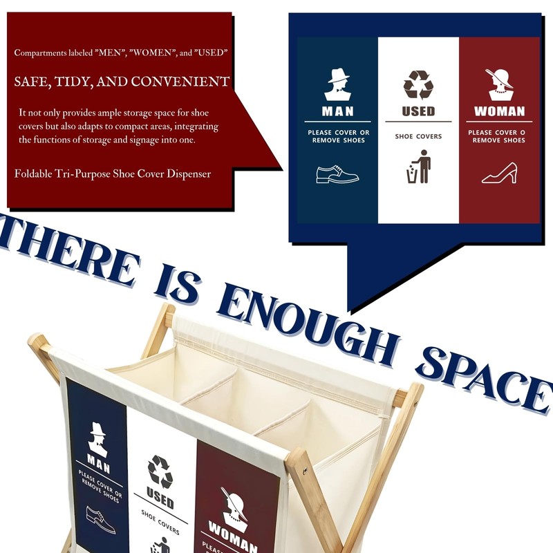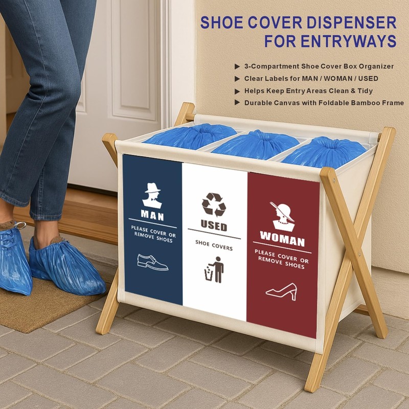 - 【3-Compartment Shoe Cover Dispenser Box】Designed with clearly labeled compartments for "MAN", "WOMAN", and "USED", this shoe cover dispenser keeps entry areas tidy and prevents mix-ups
