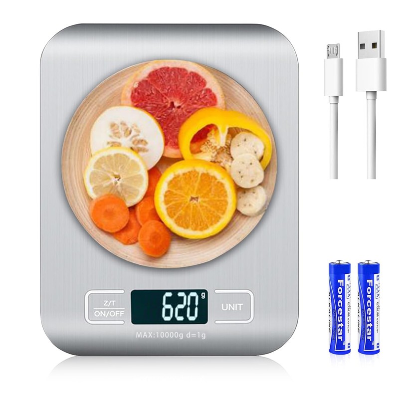 JUGLUTE Báscula Digital de Cocina USB Recargable, Báscula de Cocina de Acero Inoxidable de 10kg/22lb con Pantalla LCD, Función de Tara, Balanza de Alimentos Multifuncional para Cocina