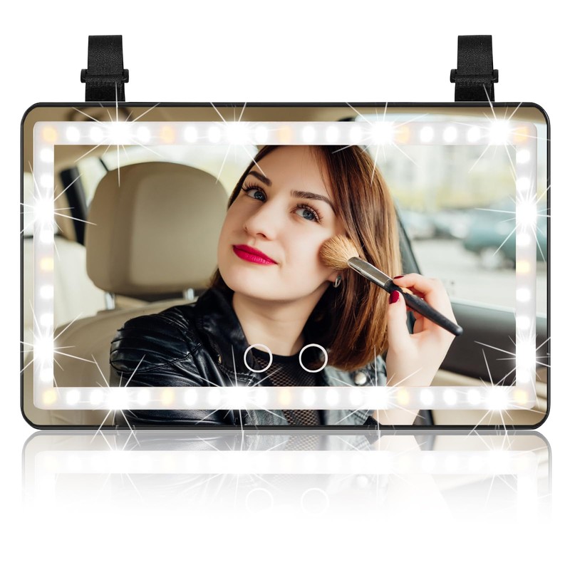 - 【Fácil Instalación】El espejo de vanidad para auto con luz mide 10,2"(L) x 5,3"(A) x 0,4"(A) y puede montarse fácilmente en la mayoría de los parasoles de coche. Cuenta con lengüetas ajustables y correas de velcro para garantizar una instalación rápida y estable y un almacenamiento flexible sin ocupar espacio adicional.