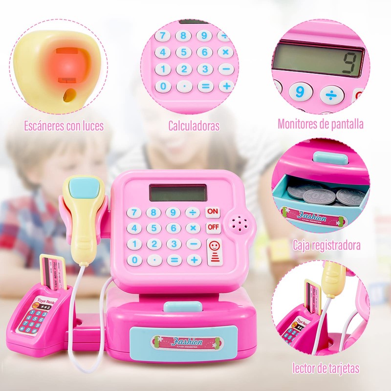 - Toque y Sonido Real: Las cajas registradoras y los escáneres emiten un "bip bip" cuando se abren y se hace clic en los botones, como una caja registradora real. Los sonidos realistas atraen a los niños a jugar y aprender.