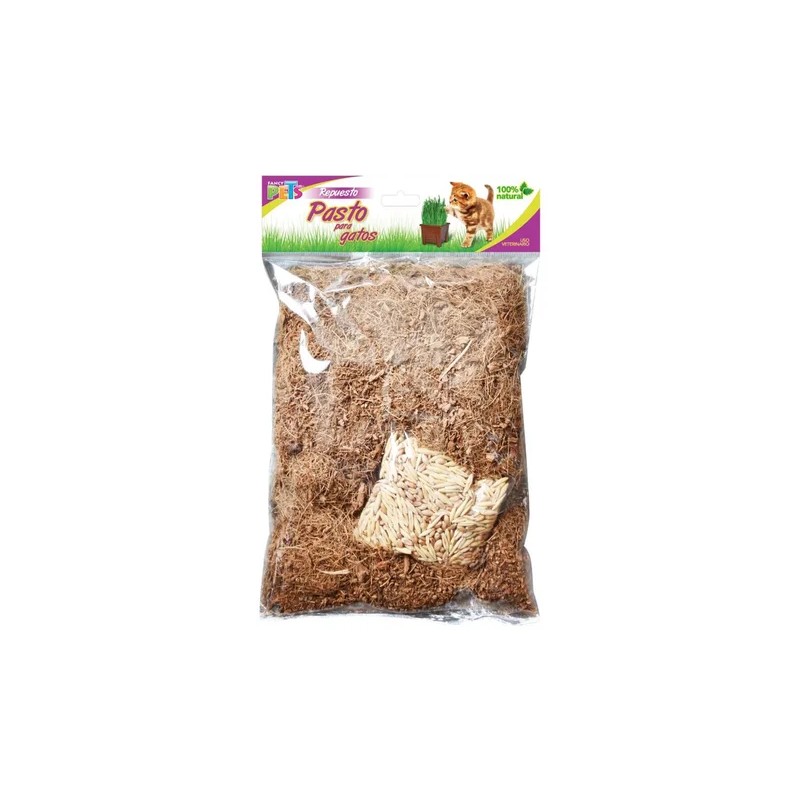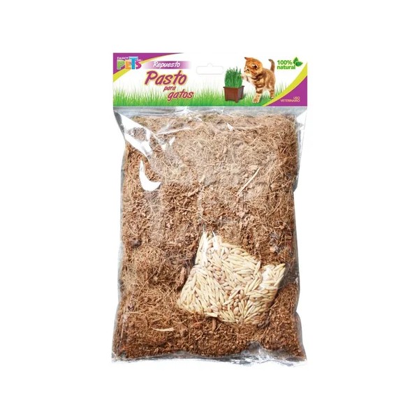 El pasto para gatos de Fancy Pets® es un kit que incluye semillas de trigo y avena, sustrato y una maceta para sembrar y mantener el pasto.
