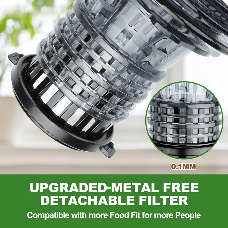 - 【Upgraded Metal-free Filter】This Slow Juicer has a split type filter screen, which is easy to install; When you finish juicing, remove it to better clean the residue. Fit for high-moisture and low-moisture fruits and vegetables. The upgraded metal-free filter is made of plastic, which will not rust and is durable.