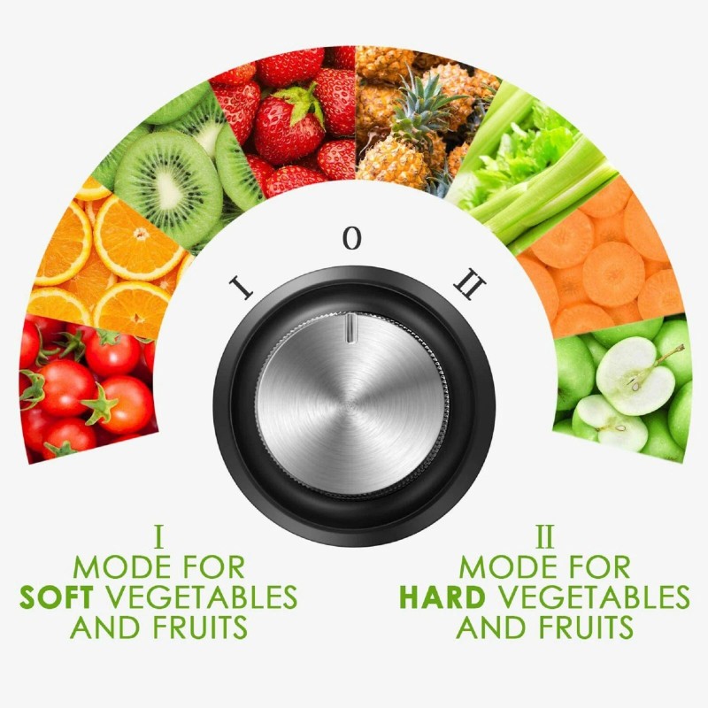 - MODO ACTUALIZADO: Potente motor con una velocidad máxima de 23500R/min. Modos de doble velocidad. El modo "Ⅰ" es para frutas y verduras blandas y jugosas. El modo "Ⅱ" es más adecuado para alimentos duros y vegetales de hoja. Dos velocidades pueden brindar la mayor eficiencia de extracción de jugo, podría brindarle un vaso de jugo fresco y de alta calidad en solo dos minutos.