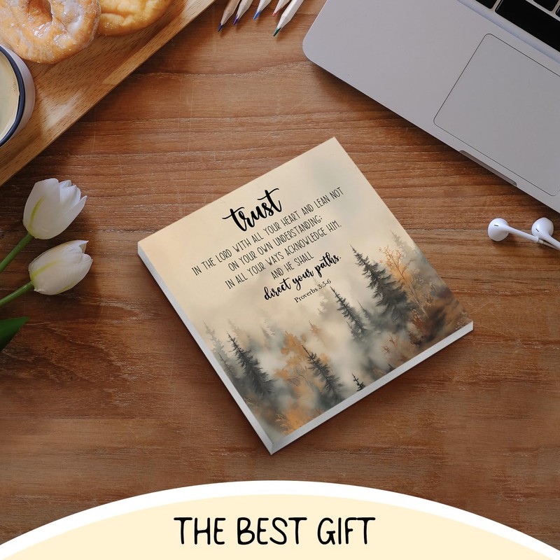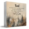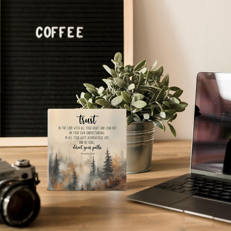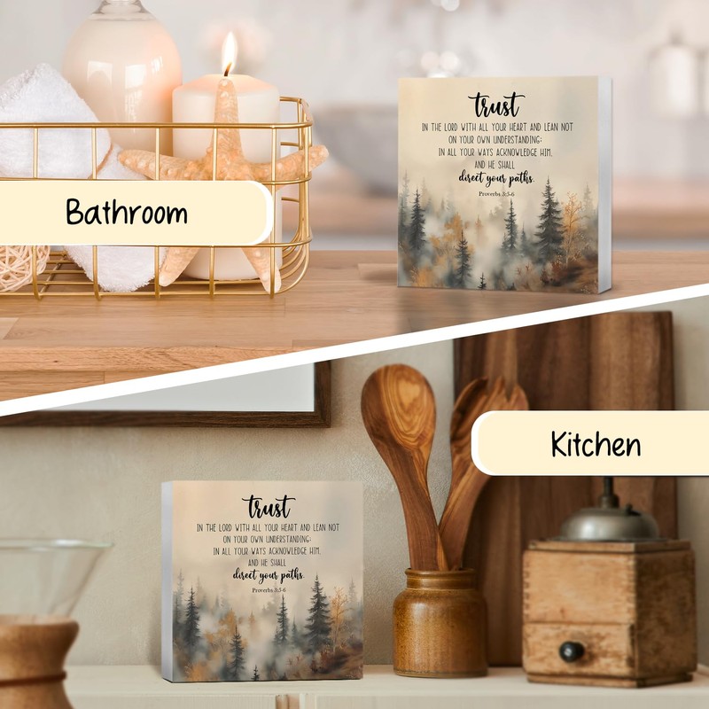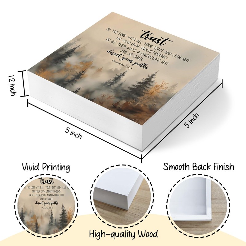 JUIOEIU Christian Desk Decor, Proverbs 3:5-6 Bible Verse Wooden Box Sign, Fall Autumn Farmhouse Foggy Forest Religious Scripture Wood Block Box for Home Office Desk Shelf Table Decor, 5x5 Inch