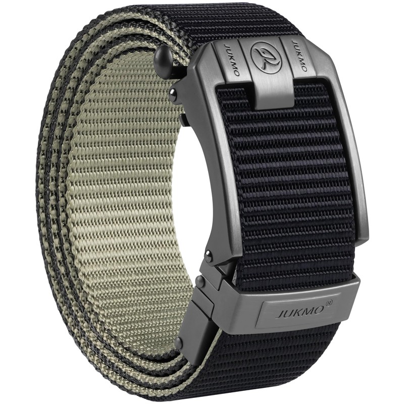 JUKMO Men's Reversible Ratchet Belt - 2 Styles in 1, No-Hole Adjustable Web Belt for Golf, Business & Everyday Wear, Black/Khiki, X-Small-for Waist 18"-34" (Length 41")