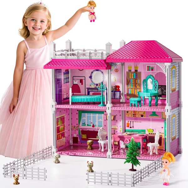 JUKUDAHU Pink Villa Playset for Girls Ages 3-7, 2-Story 4 Room House with 2 Dolls, Furniture and Accessories, Indoor Playset Girls Toys for Ages 6-8, Pretend Toddler Toy, Birthday Gifts for Kids 4-8