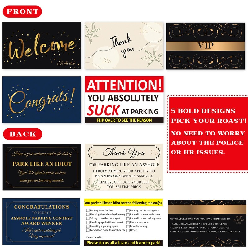 - 5 BOLD DESIGNS, ENDLESS LAUGHTER! - This card set includes 5 hilarious styles, each targeting terrible parking with a unique tone. ATTENTION cards call out bad behavior with checkboxes; CONGRATS cards mock “award-winning” parking; WELCOME cards induct drivers into the idiot club; THANK YOU cards offer fake politeness; VIP cards sarcastically celebrate selfishness. These designs aren't just funny - they're a good way to let off some steam in style.