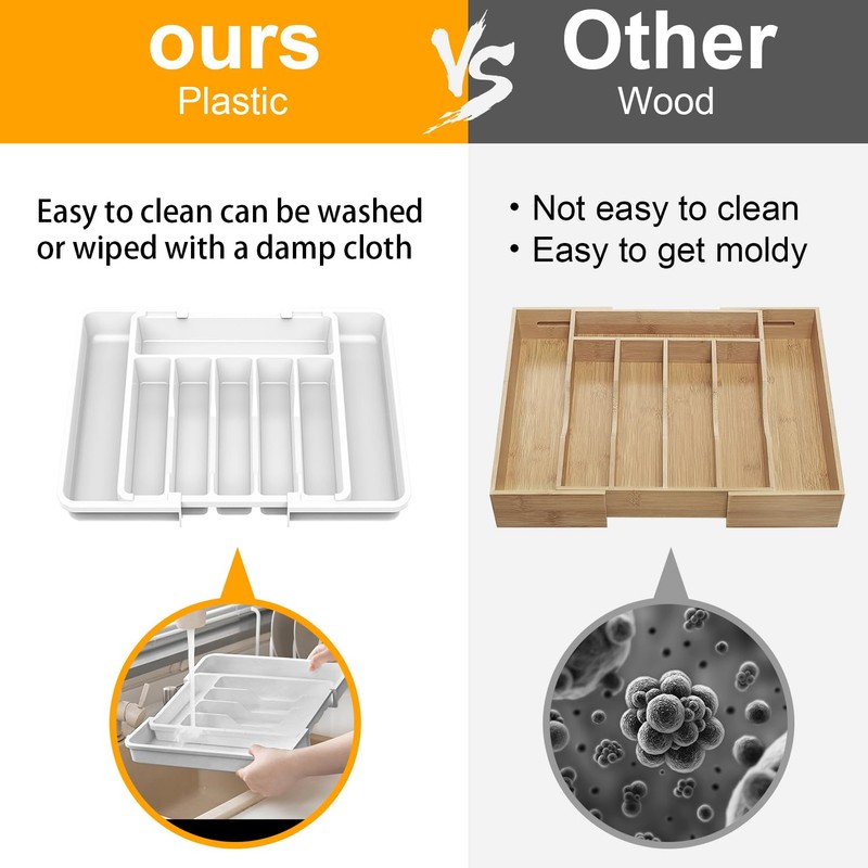 - SAFE AND DURABLE: The utensil drawer organizer is made of high quality PP material, BPA free and durable. Compared with the wooden ones, this one can be rinsed with water or wiped with a damp cloth, making cleaning easier and simpler.