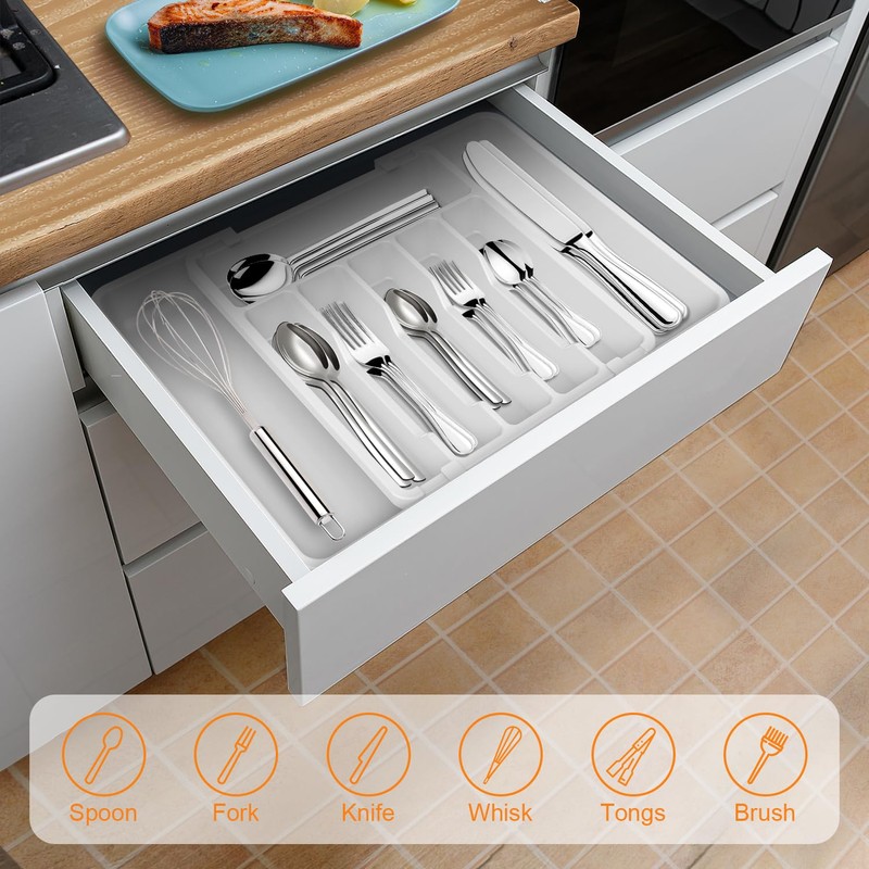 JULEHUI Silverware Organizer - Expandable Kitchen Utensil Drawer Organizer - Food Grade Plastic Cutlery Tray for Spoons Forks Knives