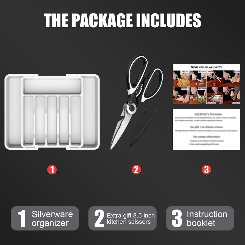 - Kitchen drawer organizer set:Includes drawer organizerx1,kitchen scissorsx1,instructionsx1.Our Kitchen Drawer Organizer Set includes 1 pcs of kitchen scissors, this combo set is great for yourself or as a gift for your wife parents or friends.