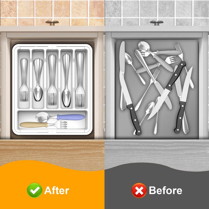 - LARGE CAPACITY: This cutlery organizer can free up more space in your drawer, comes with 8 compartments to store spoons, knives and forks, and other kitchen gadgets.