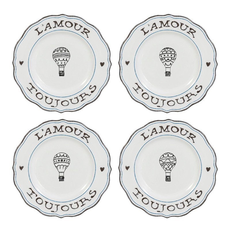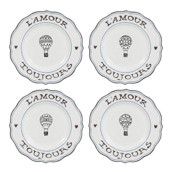 - A bold declaration of L’amour Toujours (Love Forever) is hand sketched around the scalloped rim of this unabashedly romantic dessert/salad plate, making it a stunning silhouette for layering upon other dinnerware pieces. A pair of hearts and a hot air balloon remind us to share love wherever our entertaining adventures may take us, from a slice of homemade tarte tatin with coffee for a scrumptious breakfast in the garden, to a petite salad verte served under the stars for a moonlit dinner party. Gift boxed.