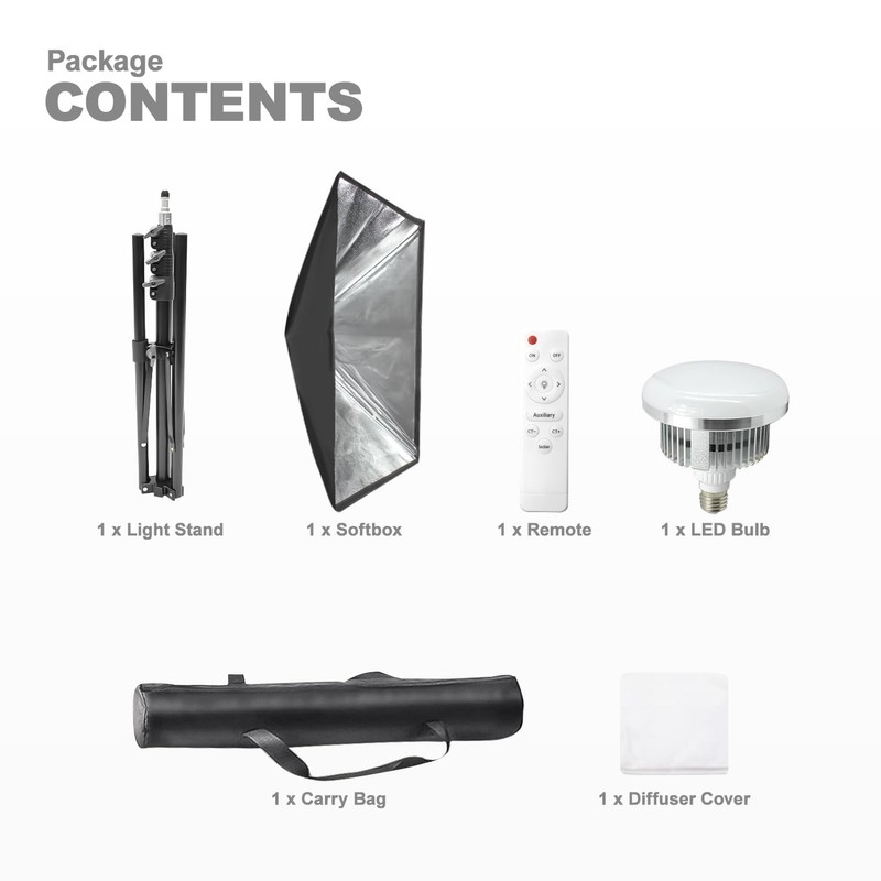 - ▶️ 【Package Includes】 (1 x) Softbox with Light Diffuser Fabric / (1 x) Light Stand Tripod / (1 x) LED Bulb & Remote Controller / (1 x) Carry Bag Case