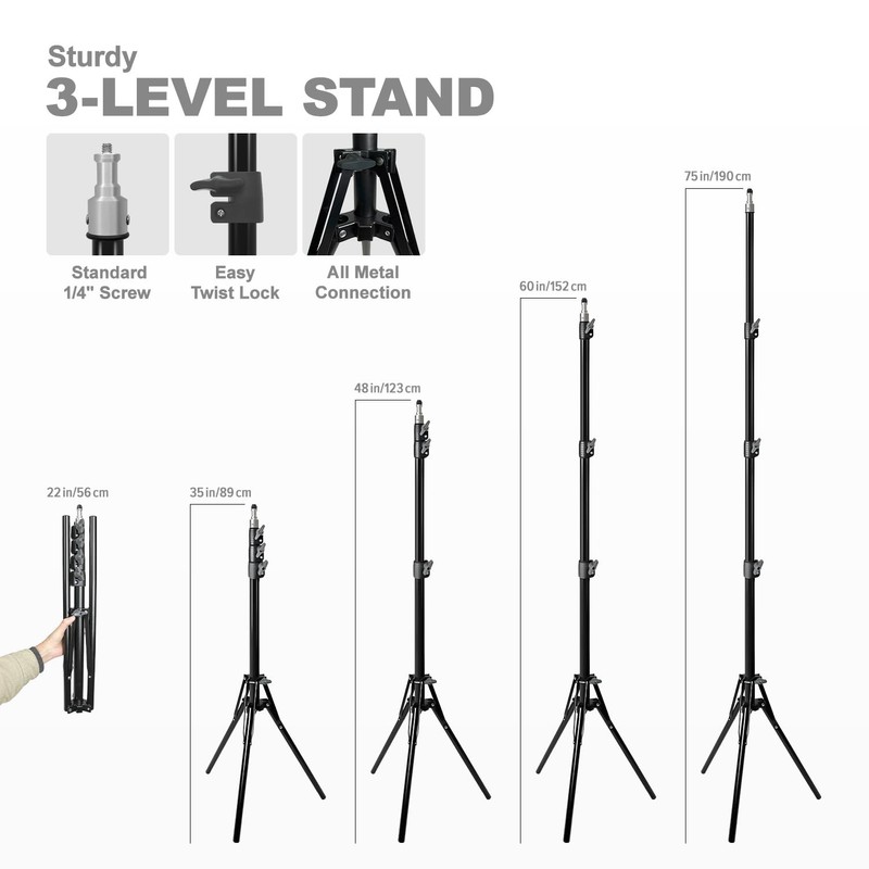 - ▶️ 【Heavy Duty Light Stands】 6 ft. Max Tall Stands / 2 ft. Min. / Strongly Built Metal Body with No Wobbles or Shaking / 3-level Height Adjustable / 0.25 inch Universal Screw Tip for Any Lighting Fixtures