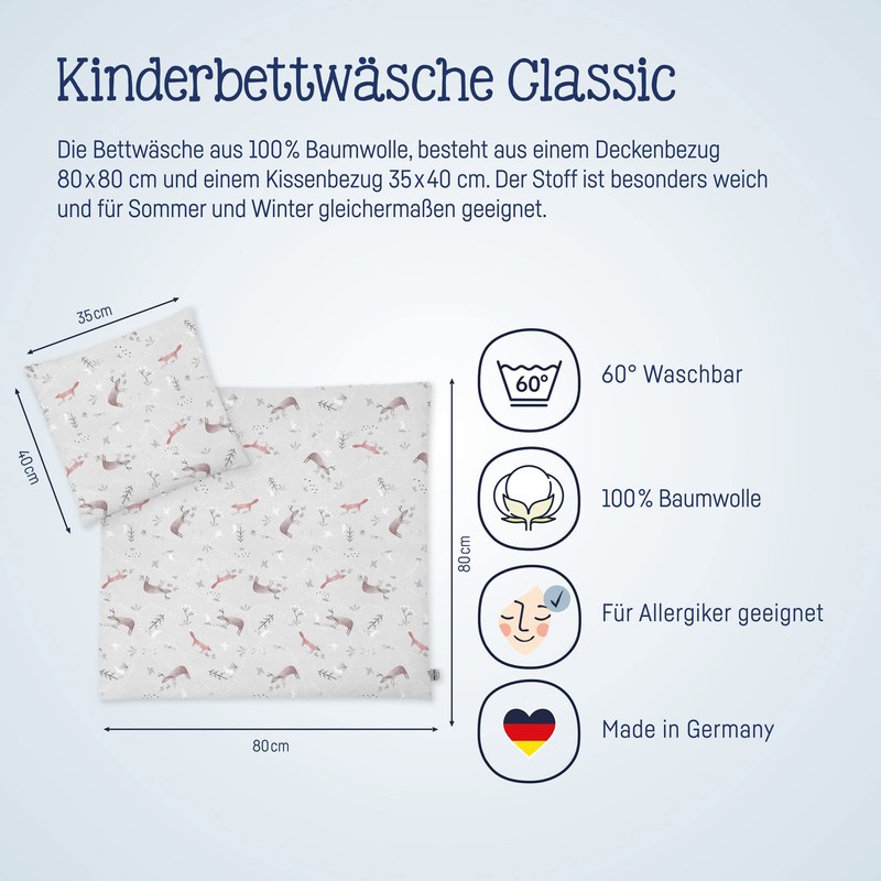 - Two-piece bedding set: the high-quality children's bedding set consists of a duvet cover 80 x 80 cm and a pillowcase 35 x 40 cm. The fabric made from 100% cotton is particularly soft and suitable for summer and winter alike
