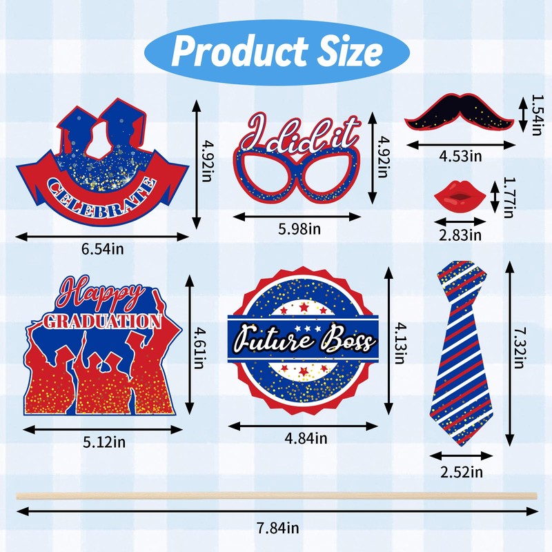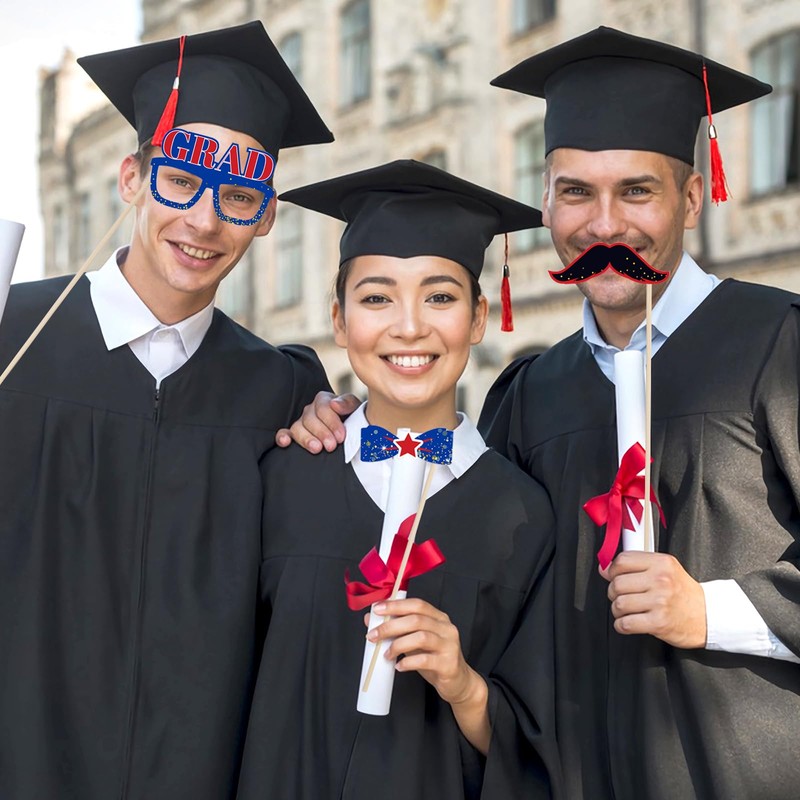 - Exquisite Design: The graduation photo booth props are designed in classic graduation celebration colors of red, white, and blue, adding youthful vitality and a joyful atmosphere to your graduation photos. The graduation party decorations 2024 are designed with graduation hats, books, glasses, ties, scrolls and other elements to make your graduation photos more outstanding