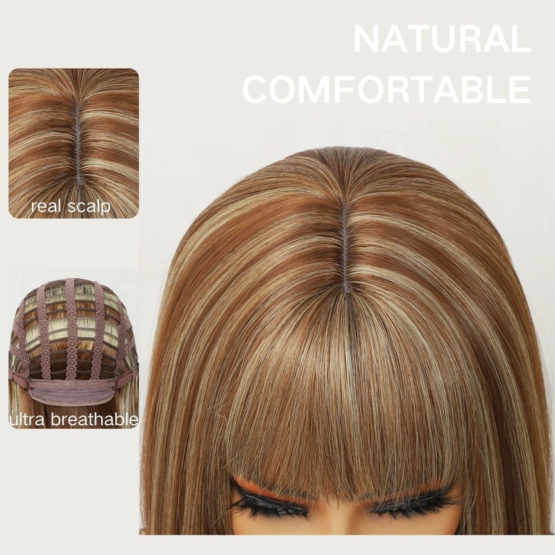 • Advantages of blonde highlight Glueless Bob Wig with Bangs: Choose this short bob wig for effortless style; Enjoy a secure, glueless fit for all-day comfort, plus easy styling options; Lightweight and low-maintenance, it's perfect for busy days when you want to look fabulous