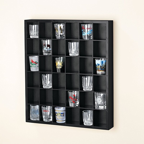 Our Wood Shot Glass Wall Curio Display holds up to 36 jiggers! Store and display your collection in this handsome showcase—it’s the perfect shot glass holder. Attractively finished wooden rack has 6 shelves for showing off your favorite shot glasses. Mounts easily on wall with included hang hooks. Each cubby is 2-1/2" x 2" x 2". Measures 16.5" x 14.25" x 2.25" Color Black