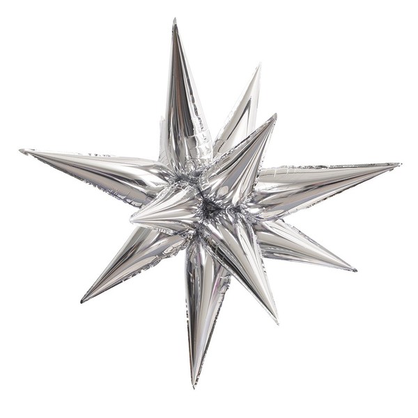 Add striking style to your next celebration with this Jumbo foil 12 Point Silver Star Balloon. With 12 foil balloons included that together create a supersized starburst shape, these Silver party supplies are sure to WOW guests at your birthday party or New Year's Eve party. To assemble, first insert your balloon pump nozzle into the self-sealing tabs on each foil balloon (do not use helium). Then, tie your inflated balloons together into six pairs by double-knotting their tails together. Finally, take two of your pairs and twist them together at their tied ends to connect them to each other. Continue adding the rest of your tied-together pairs and adjusting them to create your starburst shape. Last but not least, attach a non-metallic ribbon (not included) To these Silver party supplies and hang them from the ceiling to complete your party decor!