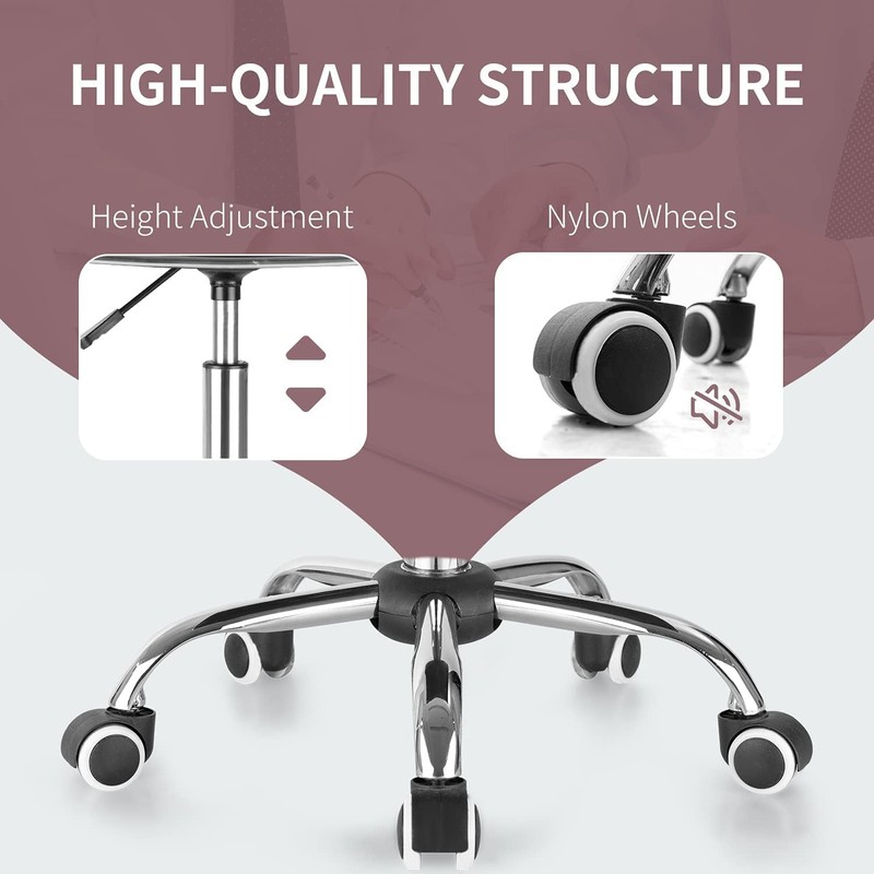 - The 360-degree rotation function can help you complete all tasks. The height of chair is adjustable to suit your table in different heights. Excellent PU rolling wheels can protect your floor from being scratched, and there is no noise when moving.