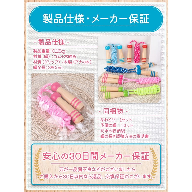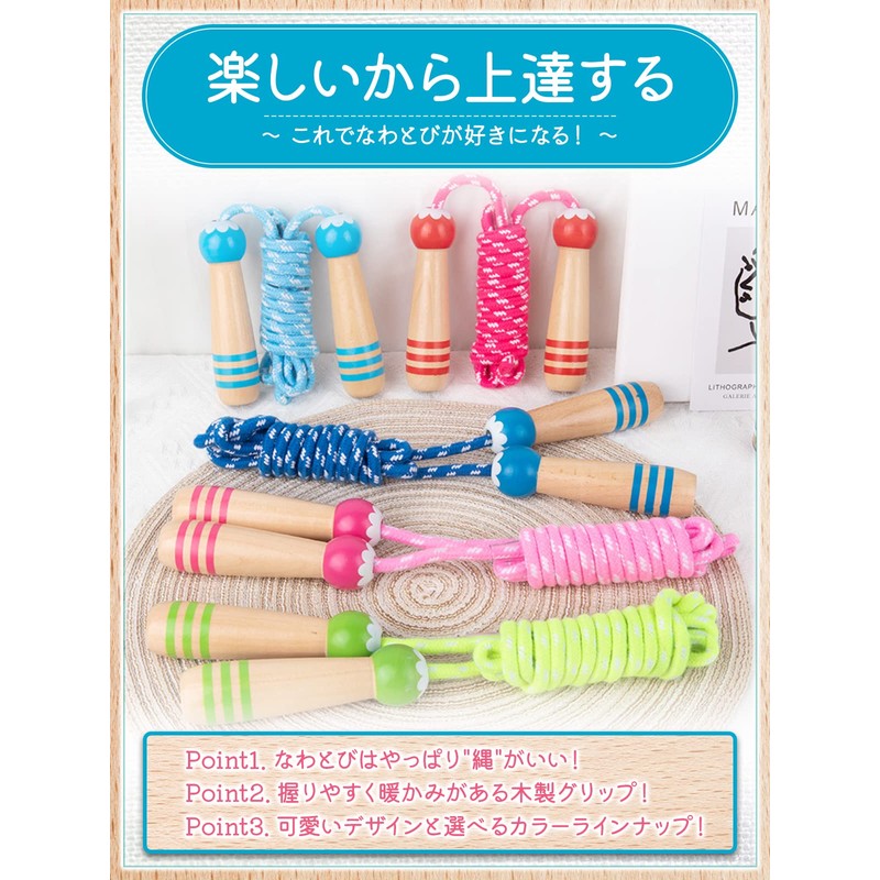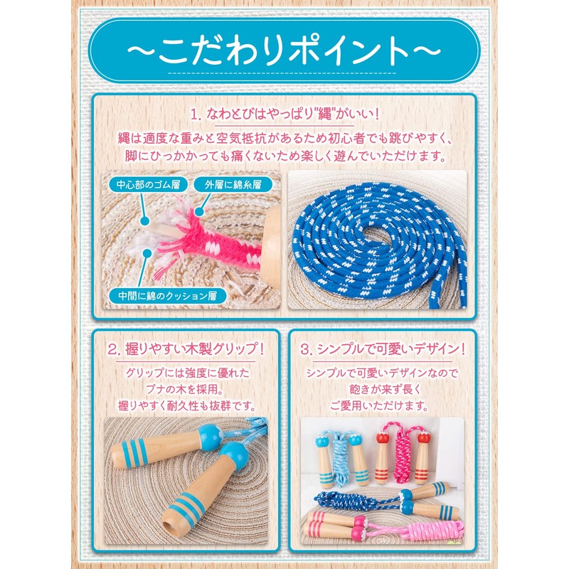 - [Jump Rope] Unlike vinyl ropes, the rope has just the right amount of weight and air resistance, making it easy for beginners. In addition, since it does not hurt even if it gets caught on the legs, kids from toddlers who jump ropes for the first time to junior elementary school students, this jump rope has been aimed to be able to enjoy jumping rope