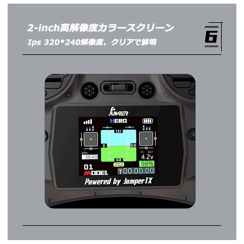 - 2" 320*240 LCD Touch Panel Vibrant colors, 2" IPS screen is easy to use. Equipped with a highly flexible JUMPER TX. It has a wide variety of functions and expandability to accommodate various RC applications
