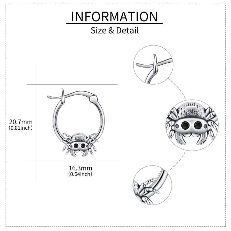 - 【Sterling Silver Spider Earrings】Jumping spider earrings are made of genuine 925 sterling silver, making they ideal for long-lasting wear, especially for those with sensitive skin. The size of Jumping Spider hoop earrings: 0.64*0.81 inch