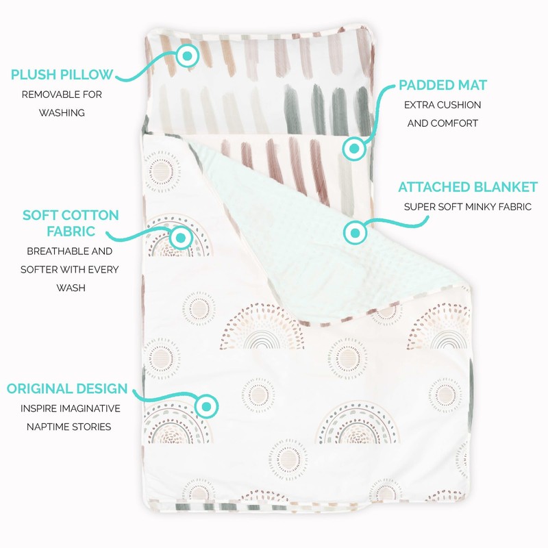- Unmatched Comfort - Our cozy toddler sleeping bag is designed with a plush pillow, soft blanket, and padded mat. Our sleeping mats for kids provide ultimate comfort, making naptime your child's favorite time of day.