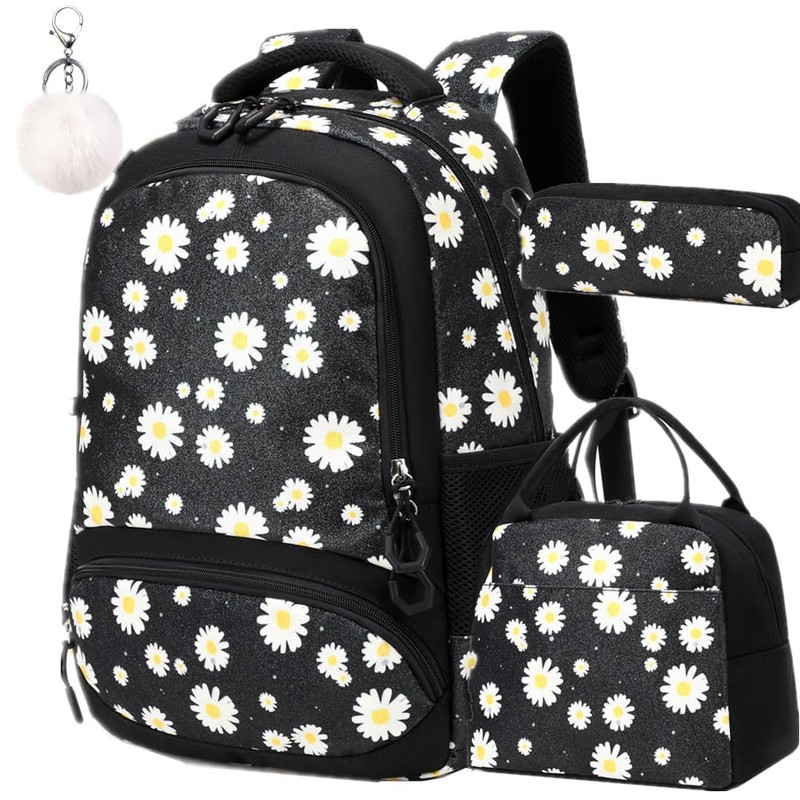 Jumpopack Daisy Printed School Bags for Girls 3 in 1 Book Bag Set Large Capacity School Backpack Set with Lunch Bag Pencil Case