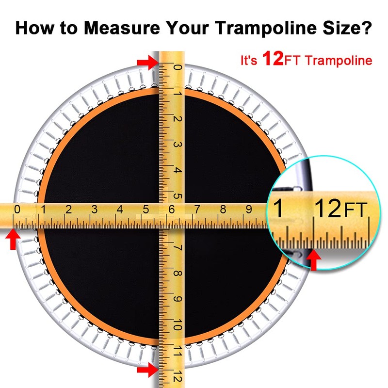 - NOTE: The trampoline mat dia is 127in, only compatible with 12 ft trampoline frame, 72pcs 5.5in spring, can't fit for 14 ft, 15 ft trampoline frame