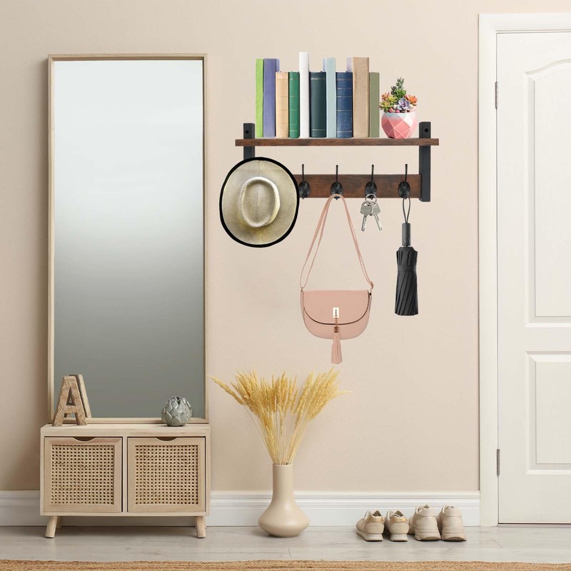 - 【2-in-1 Design】Each wall coat hanger has a 43.5*19.2*11.5cm/17.1x 7.55x 4.52inch panel on top, which provides additional storage space for photo frames, potted plants and collectibles, etc. It is equipped with 5 smooth hooks to store clothes, bags, keys, umbrellas, etc. You don't have to worry about not finding the key when you go out anymore