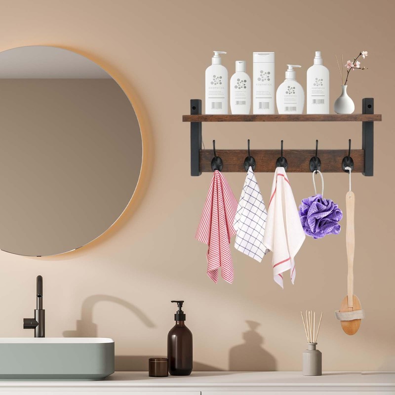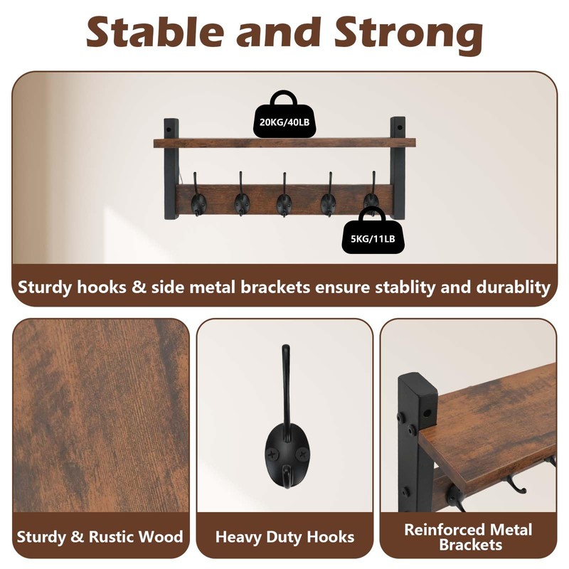 JUMRHFAN Coat Rack Shelf Wall Mounted, Wooden Coat Rack for Wall with 5 Double Metal Hooks, 44cm L Floating Shelves Key Holder for Bedroom, Bathroom, Living Room