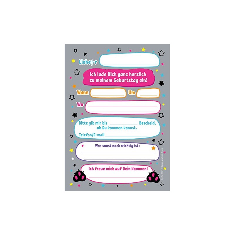 The great invitation cards offer plenty of space to fill in. To enter all important data, there are pre-printed fields on the back of the pretty card. Here the invited guests will find all the important information. When does the party take place? Where is celebrated? And of course, the phone number must not be missing for any queries. On an extra field for other remarks, the hostess can also note one or the other important message. Here, for example, she can write down your favourite wish or announce that a fancy dress party is planned.