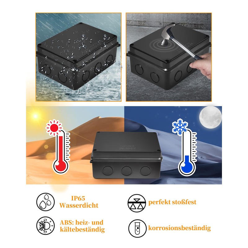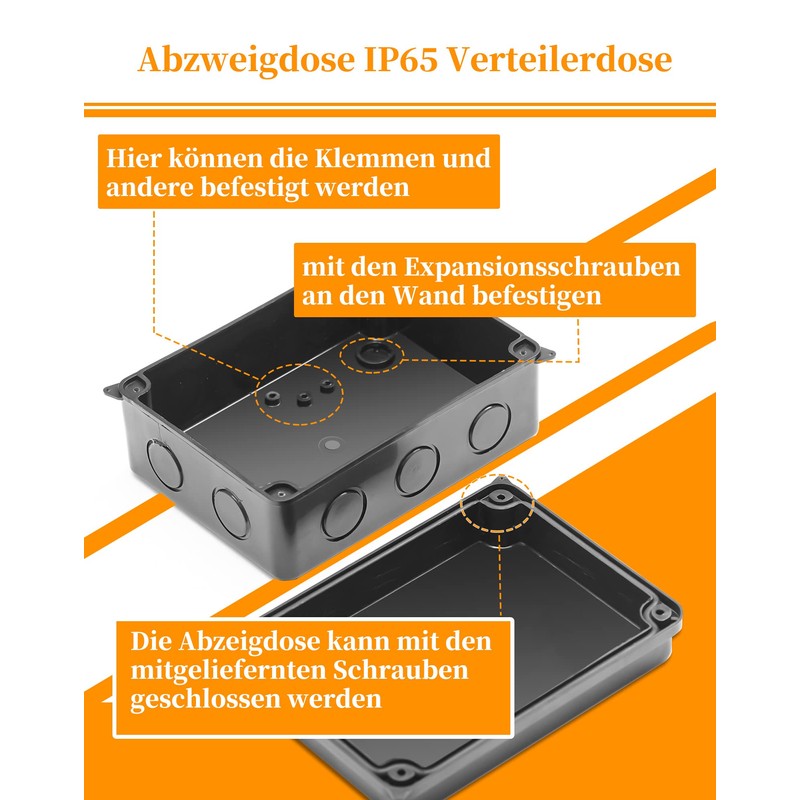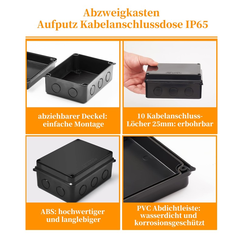 - IP65 surface-mounted box - waterproof: the IP65 waterproof surface-mounted junction box, super dense, dustproof and durable, is for protection against dust, corrosion and splashes of water. Complete set wet room box surface-mounted is suitable for any indoor use, but also very rainy outdoor areas. This junction box is mainly used for electrical, communications, electronics, electricity and construction sites indoors and outdoors
