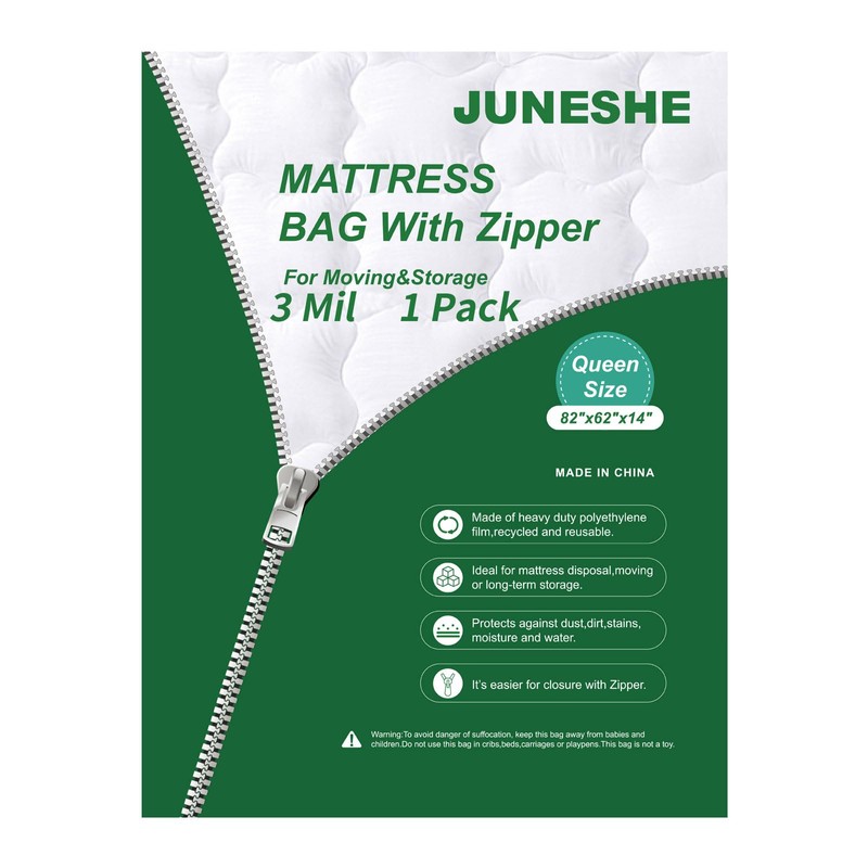 JUNESHE Mattress storage bag is made of 3 Mil thick new, clear polyethylene. It's heavy duty enough to keep your expensive mattress safe while moving. With zipper on the end, it's very easy and time-saving to seal.