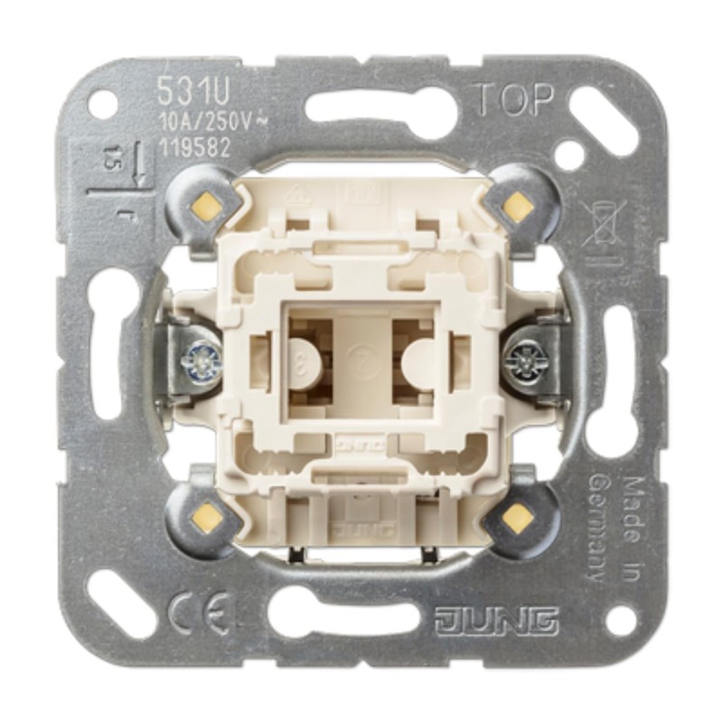 531 U 1-gang push-button insert 10 AX / 250 V ~ Screwless terminals for wires up to 2.5 mm2 Can be converted into pull cord push-button by means of pull cord insert ref.-no. 34 or 34 KO5. Without claws: ref.-no. with additional "E", e.g.: 506 EU